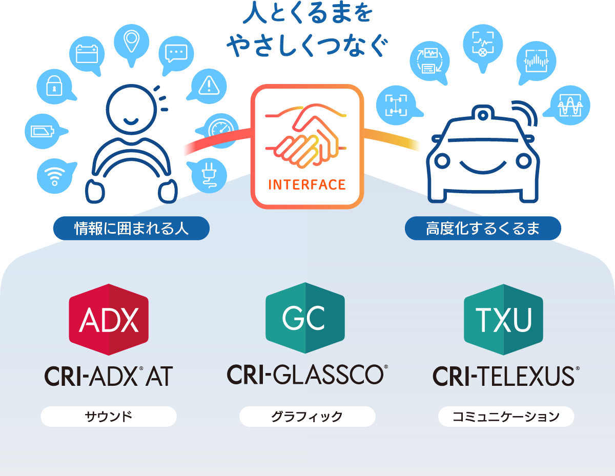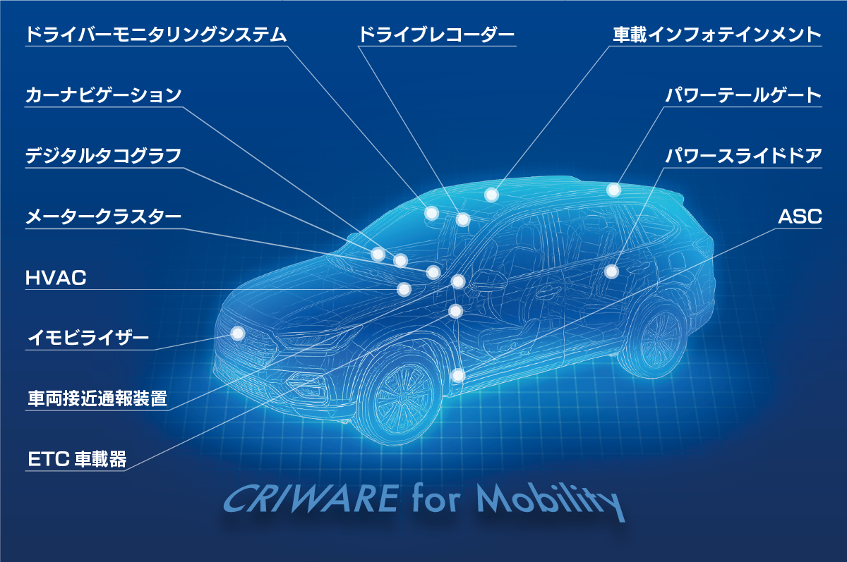 CRIが創業以来、ブランド「CRIWARE®(シーアールアイウェア)」としてゲーム向けに提供してきた音声や映像、グラフィックス等の技術を、モビリティ向けにカスタマイズし、提供しています。