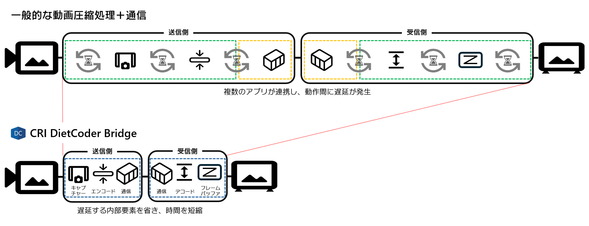 ハードウェア本体への組込が困難な場合、外部に小さな機器を追加して、圧縮・低遅延化を実現。