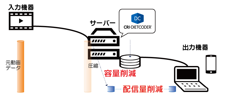 「CRI DietCoder」は画質劣化なしに、動画データサイズを10分 の1に圧縮するトランスコードシステムです。