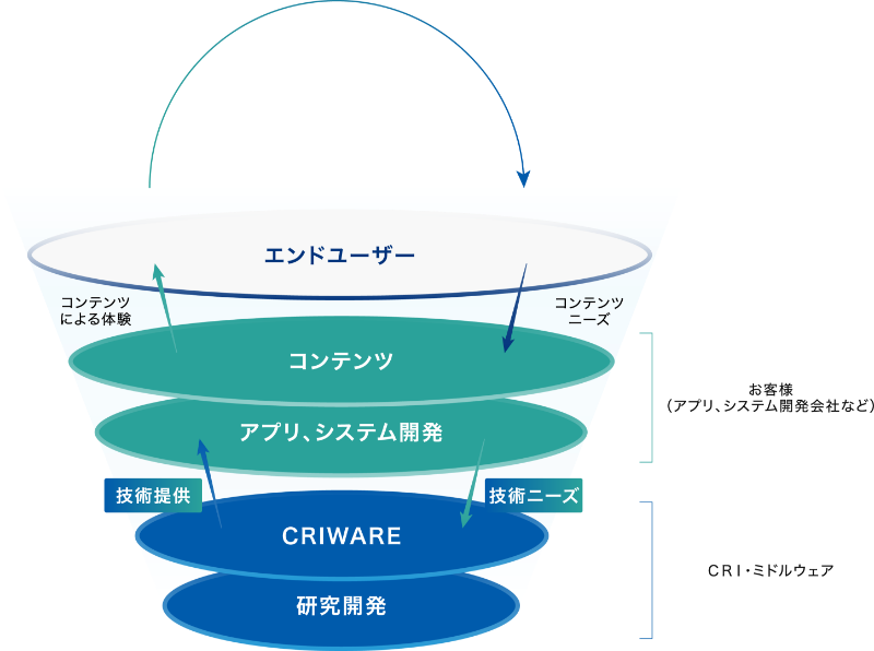 私たちの研究開発から生まれたCRIWAREが、お客様のアプリやシステムに技術を提供し、生まれたコンテンツはエンドユーザーの元へと届けられていきます。それをきっかけに生まれた新しい要望を当社が的確にキャッチし、次の研究開発に生かします。このような技術の循環でCRIWAREをパワーアップし続け、社会をより豊かにしていきます。