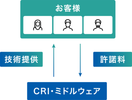 当社は、長年ゲーム分野で培ってきた音声や映像のデジタル信号処理技術を汎用化、他の分野向けにカスタムし提供しています。お客様からは当社技術の利用料を「許諾料」として頂いています。
