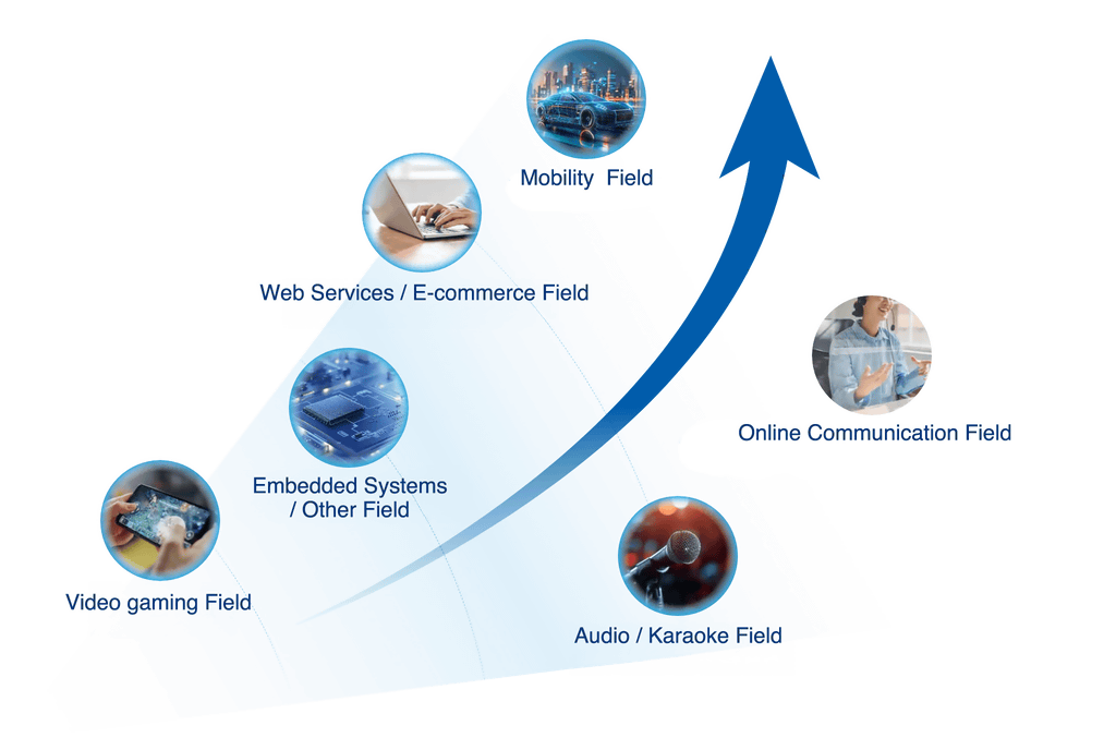 We transform the results of research and development in audio and video into products known as “middleware” and deliver them worldwide. Technologies we have refined in the video gaming field, such as real-time processing, are now extending into mobility, embedded systems, and e-commerce sites.