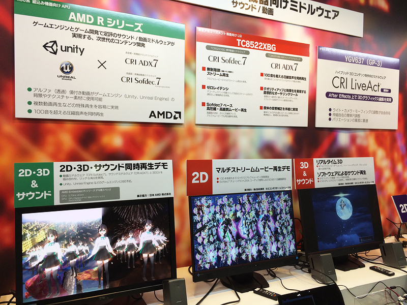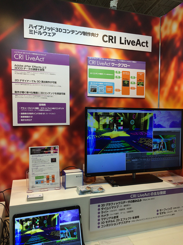 | 出展概要 | ■Adobe After Effectsでのリアルタイム3DCG・UI制作を実現する「CRI LiveAct」 CRI LiveActはAfter Effectsでの3DCG演出を可能にするコンテンツ制作向けミドルウェアです。LiveActの導入によって、通常は難しいAfter Effects上での3DCGを使ったシーンの編集・調整が容易に実現できます。OpenGLでの複雑なプログラミングも不要です。アミューズメント機器向けコンテンツのリッチ化や制作時間の短縮を実現します。 また、3DCGを360度回転して細部を確認できるガイドなど、3DCGならではの表現を取り入れたリッチなUI制作にもご活用いただけます。 活用例: ・アミューズメント機器向けコンテンツ ・自動車メーター、医療機器、銀行ATM、コピー機などのUI ■次世代アミューズメント機器向けLSI対応 サウンド/ムービーミドルウェア ヤマハ次世代LSIをはじめとする各種プラットフォームに対応した、アミューズメント機器向け動画/音声再生ミドルウェアを実機上のデモでご紹介します。 ・アミューズメント機器向け高音質・高機能サウンドシステム「CRI ADX7」 ・アミューズメント機器向け高画質・高機能ムービーシステム「CRI Sofdec7」 ■組込みマイコン向けサウンド/ムービーミドルウェア 家電や業務用機器に対応した、組込みマイコン向け動画/音声ミドルウェアをご紹介いたします。実際に採用された家庭用電化製品(シャープ)の実機を展示いたします。 ・省回路型の高出力サウンドミドルウェア「D-Amp Driver」 ・組込みマイコン向けサウンド再生ミドルウェア「かるイイ音」 ・組込みマイコン向けムービー再生ミドルウェア「かるエエ像」 |