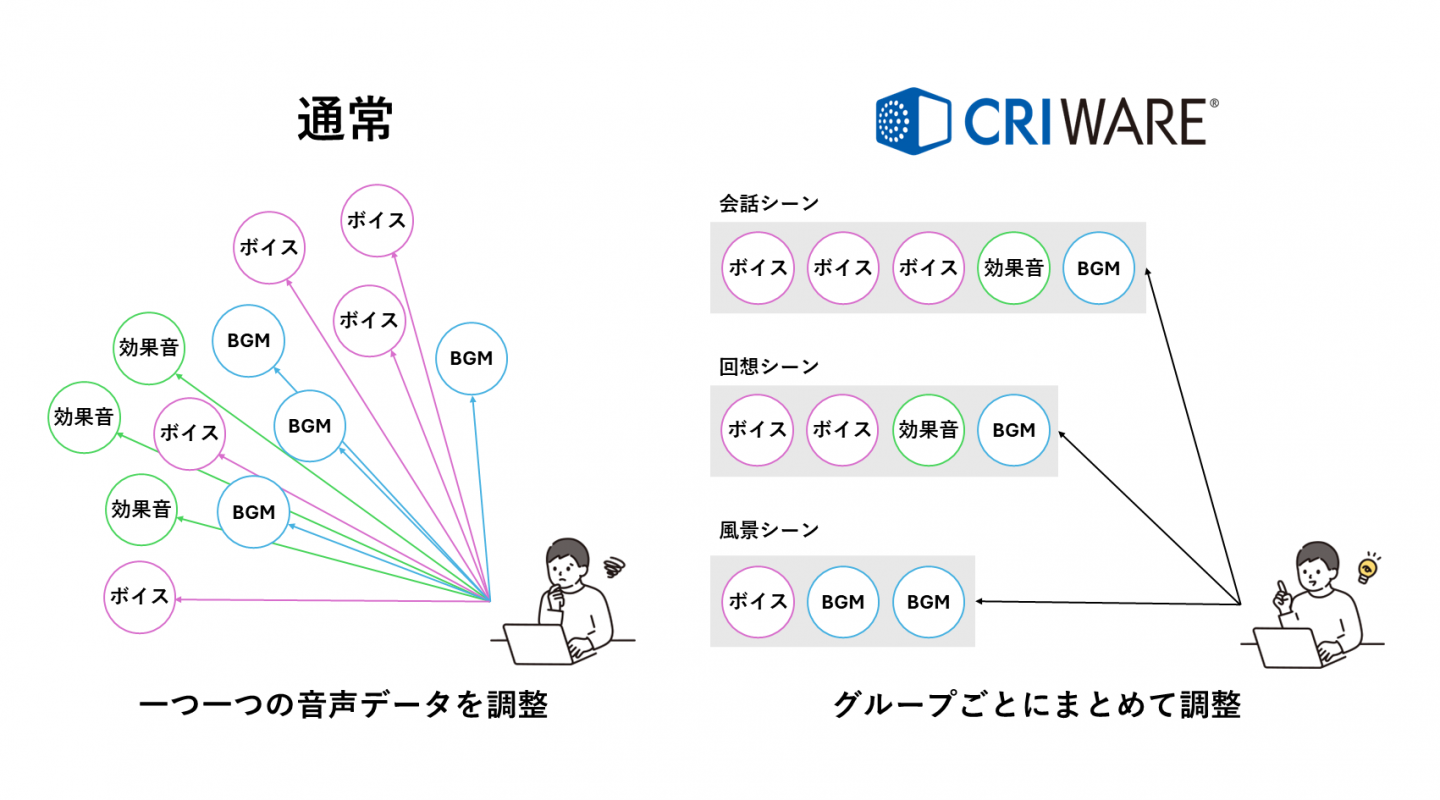 ゲーム内で音声を再生するには細かなサウンド調整が必要です。例えばキャラクターが話している最中はBGMの音量を下げる、複数のキャラクターが登場したら同時に話す人数を制限する、などです。CRIWAREはこのような音声データを効率よく調整、管理可能なツールを提供しています。