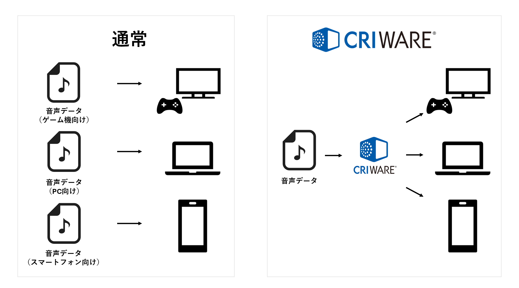 CRIWAREを利用すればこの作業の自動化が可能です。一つの音声データを作るだけで各プラットフォーム向けに最適な調整が行われ、手間が大幅に軽減されるのです。