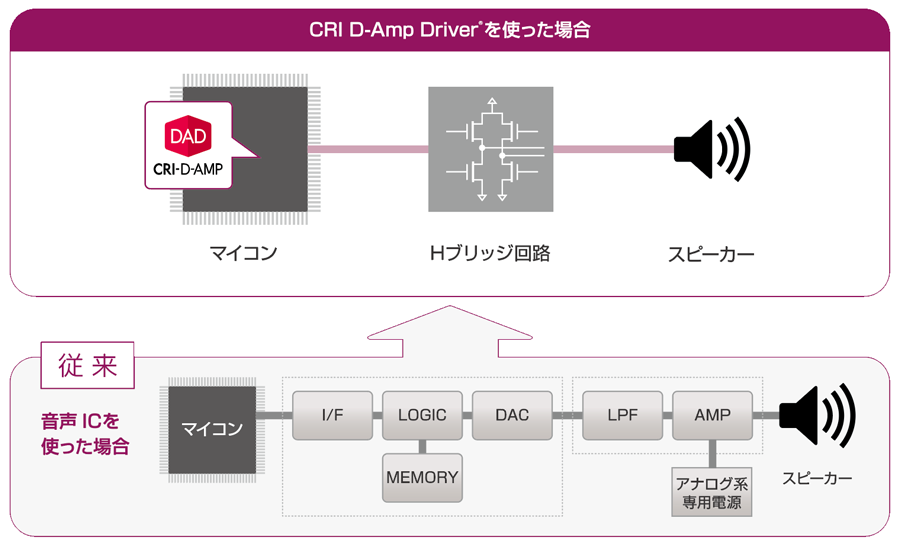 CRI D-Amp Driverは音声処理をソフトウェア上で行います。これによりハードウェアの部品を減らし、製品の小型化や製造コストの削減が見込めます。