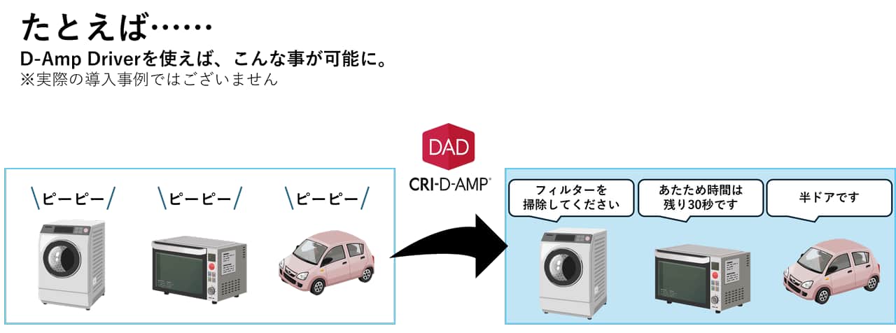 CRI D-Amp Driverは家電や車、医療機器など、身近な機器の音をより良く、多様化する技術です。今後は通知音や案内音だけではなく、好きなアーティストの曲や声優の声まで、いろいろな音を楽しめるように開発を進めています。