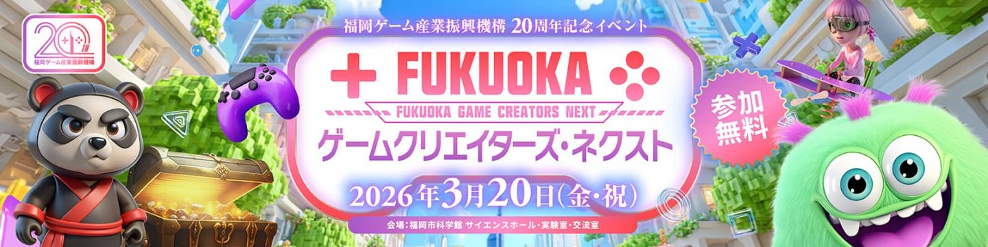 「FUKUOKA ゲームクリエイターズ・ネクスト」は、福岡ゲーム産業振興機構の設立20周年を記念して、2026年3月20日(金・祝)に福岡市科学館で開催されるイベントです。